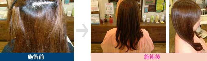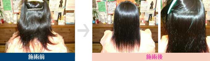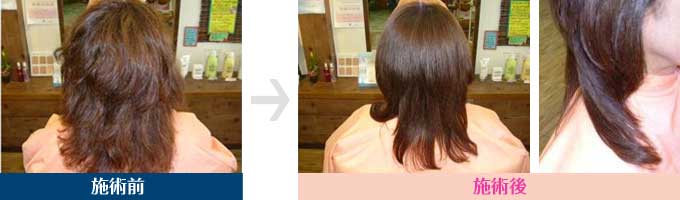癖がちょっと強めです→根元から毛先までつやつやになりました カラーリングも同時施術しました